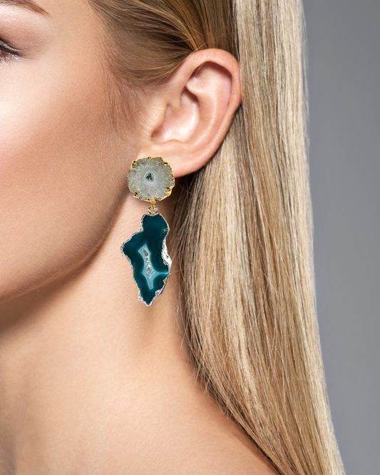 One of a Kind White Solar Geode and Teal Blue Agate Statement Earrings