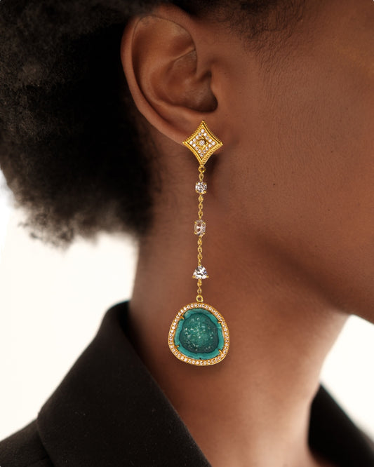 Emerald Green Geode and Crystal Gold Statement Drop Earrings