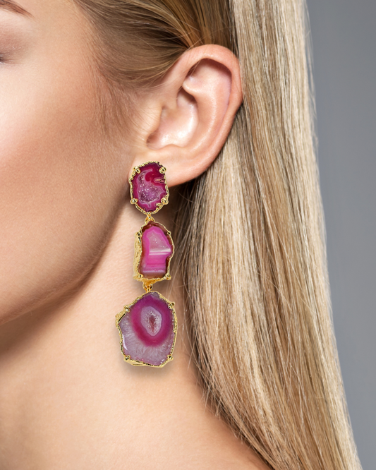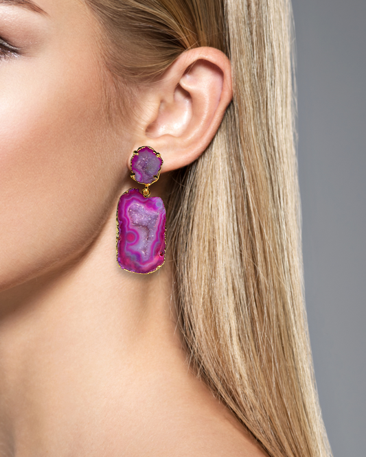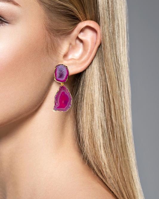One of a Kind Hot Pink Geode and Agate Crystal Statement Earrings