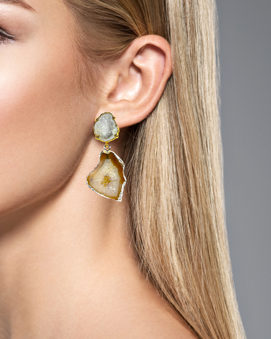 One of a Kind White Geode and Tan Agate Statement Earrings