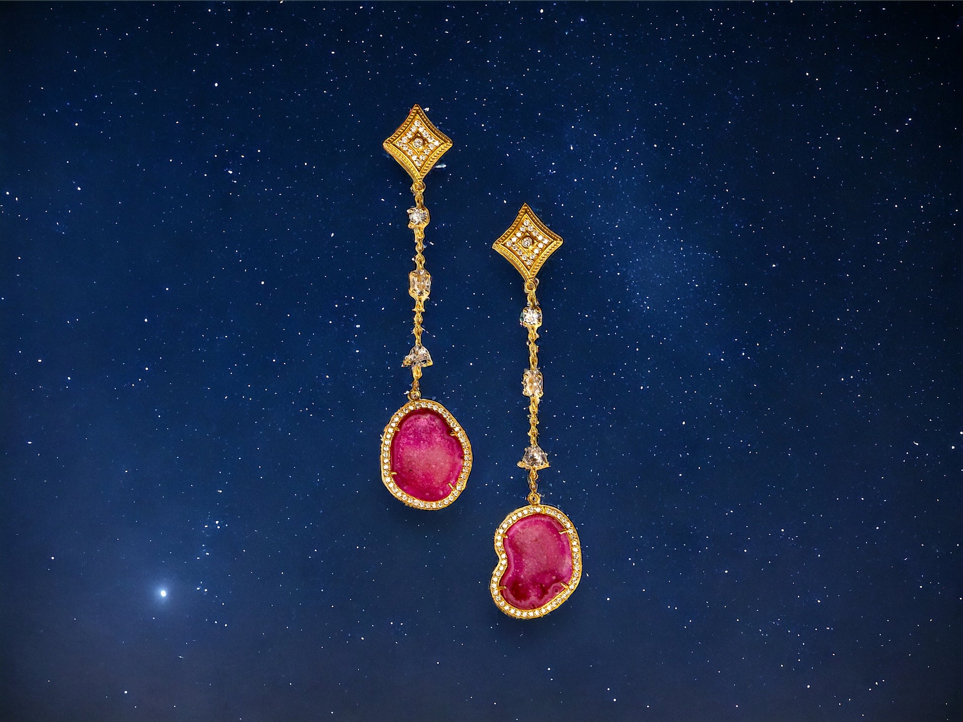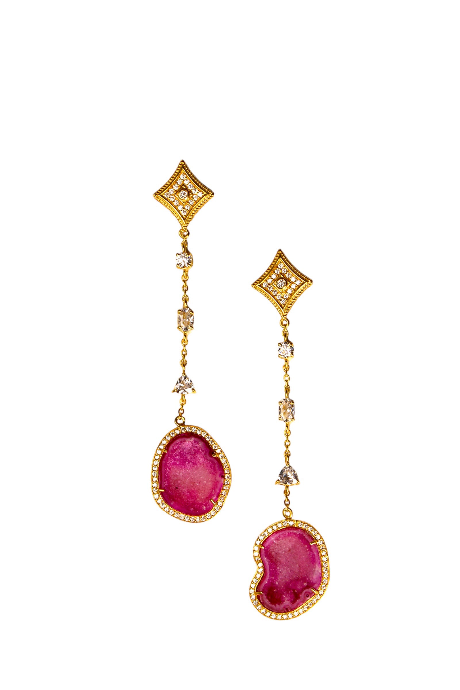 Hot Pink Geode and Crystal Gold Statement Drop Earrings