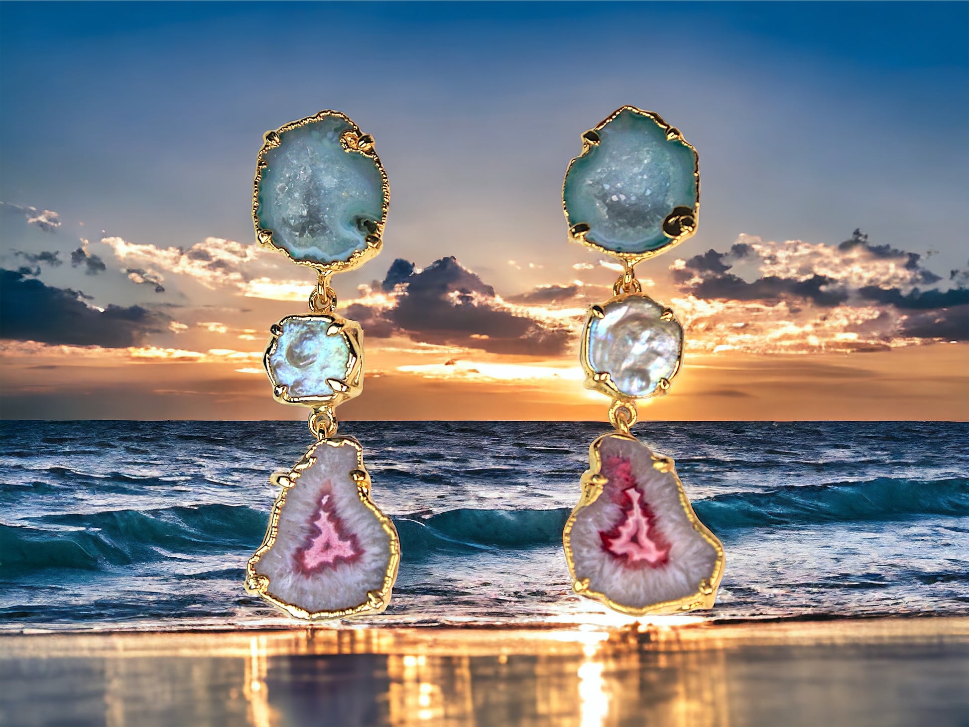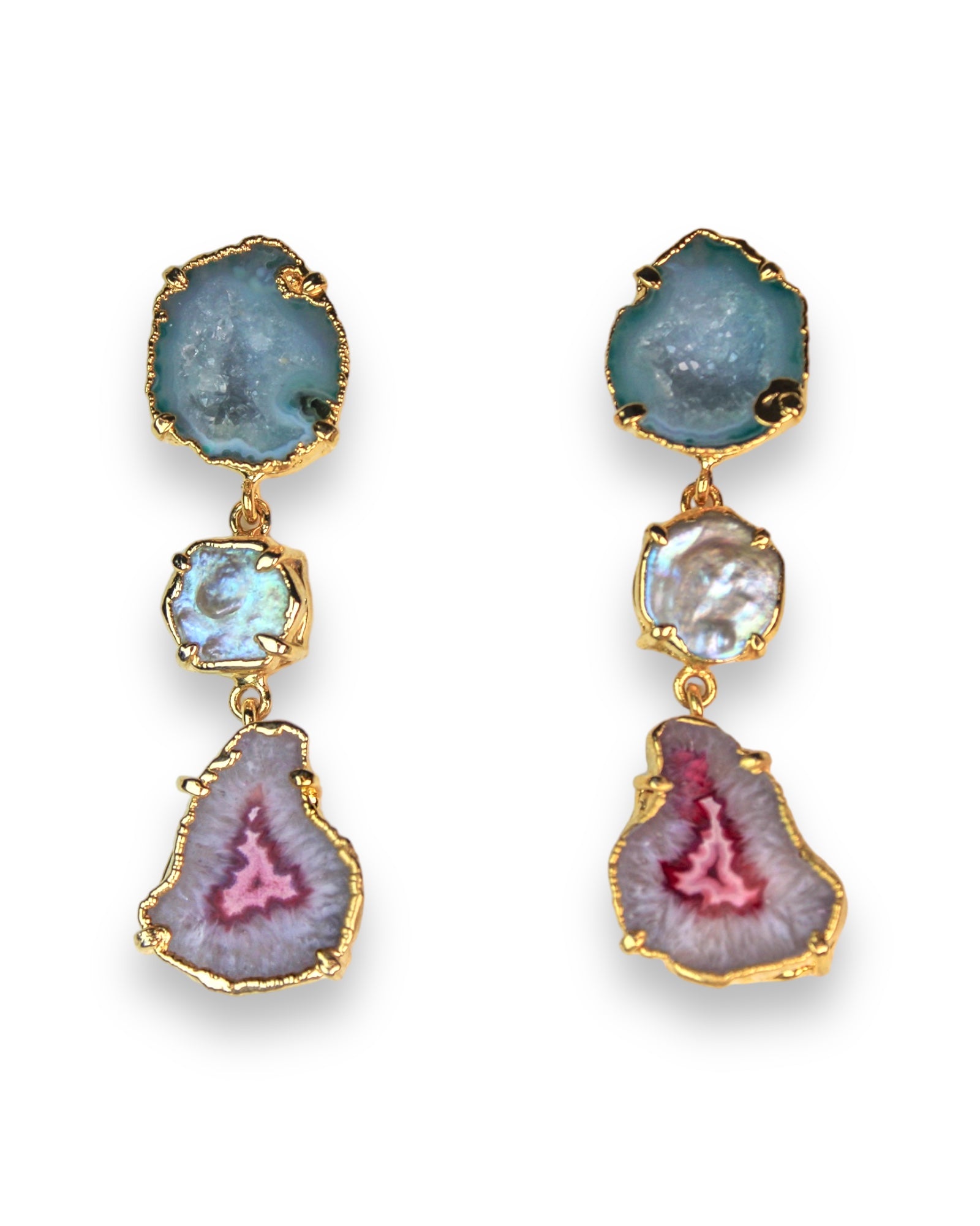 The Stella Earrings by AMINA JOHAN feature three tiers of one of a kind ocean blue crystal geodes with iridescent pearl and pink striped agate, set in 24k plated gold hardware.